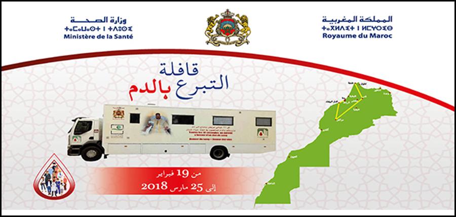 Une caravane pour le don de sang, est organisé à travrs le Royaume du Maroc, du 19 février 2018 au 25 mars 2018. Le ministre de la Santé, Anas DOUKKALI, a procédé, lundi 19 février, au lancement de cette caravane de don de sang qui va couvrir plusieurs régions du Royaume. Cette caravane placée sous le thème «Le don de sang, une responsabilité de tous» va se poursuivre jusqu’au 25 mars prochain et permettre de collecter 4.500 poches de sang, quantité suffisante pour couvrir les besoins en sang d’une semaine. Elle a également pour but d’insuffler aux donneurs potentiels de sang la culture du don de sang et les sensibiliser à l'importance de ce geste.